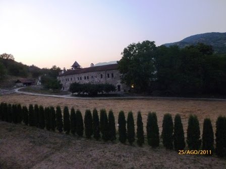 Dormiamo nella foresteria del monastero. Dopo la cena frugale in refettorio, spazio alla passeggiata nel silenzio circostante. Io mi avvicino al caseggiato dove vivono i monaci. Vedo uno, molto anziano, seduto su una sedia intento a leggere. Un concerto di cicale che friniscono inneggia al manto stellato. E’ emozione particolare dormire nella piccola cameretta, essenziale ma accogliente. Dalla terrazza respiro aria pulita e silenzio tra le montagne della Serbia, così sconosciuta, così lontana. Il sonno è interrotto da abbaiare di cani, miagolii di gatti, frullar d’ali di uccelli festanti,suoni brevi di campane, alle 5.30 e alle 6.15. L’alba è chiara. Gli occhi sono vispi di buon mattino. Colazione. Si parte per il monastero di Zica a Kracujevac. 60 Km da Studenica.